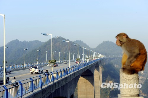 11月4日清晨,一群野生猕猴出现在贵阳市小关特大桥的山上,它们不时在路边向行人觅食。附近的居民猜测,这群野生猕猴估计是从黔灵山公园野生猕猴群中“溜”出来的。中新社发 彭年 摄