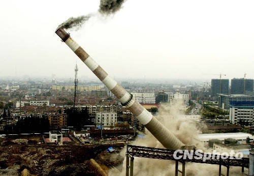11月11日下午,江苏省淮安市主城区最高建筑物——淮阴发电有限公司150米烟囱爆破成功。该烟囱的爆破拆除是为了配合该市今年工业技改项目中最大的节能减排项目——投资12亿元的淮阴发电有限公司第二台300MW级热电联产工程而进行的。 中新社发 淮安曹政 摄