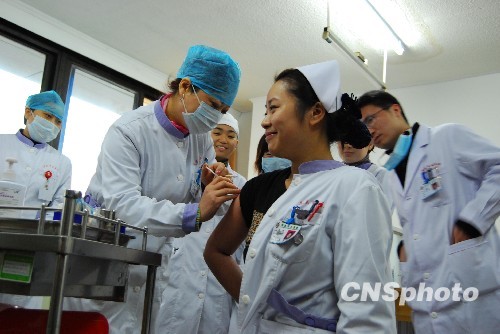 11月11日上午,安徽省安庆市首批6.6万支甲型H1N1流感疫苗开始接种,安庆市立医院传染病医院护士小陈成为该市首批甲流疫苗接种第一人。据介绍,按“知情、自愿、免费”原则,安庆市将有约6.6万名关键岗位的公共服务人群接种疫苗。中新社发 艾裴 摄