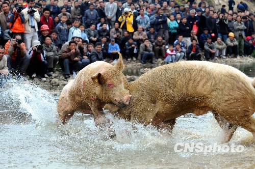 11月11日,“2009中国雷山苗年”系列活动中出现罕见的“斗猪比赛”,两头公猪在水中激烈争斗,岸边民众拍手称快。中新社发 侯宇 摄