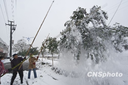 2009年11月12日下午,济南市平阴县园林工人清理街道两侧树木积雪,为树木减负,确保减少暴雪给园林树木带来的灾害。当日,济南遭受五年来最大一次降雪。中新社发 俄国庆 摄