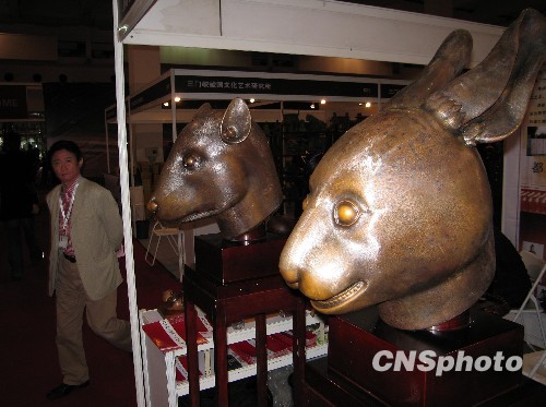 11月13日,由中国文物学会、上海世博集团主办的“2009中国仿古工艺品及技术展览会”在上海开幕。中国国家博物馆、故宫博物馆、天津博物馆、辽宁博物馆等,以及众多企业在展会上展出各种国宝级文物的仿制品。图为仿圆明园铜兽首,与原作有异曲同工之妙。中新社发 姜煜 摄