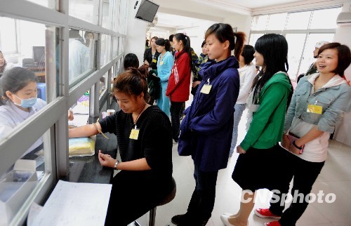 11月14日,适龄应征女青年在福州一所医院的征兵体检区内有序等待接受体检。当日,为了做到“公正、公开、透明”,福州市征兵办明确规定在体检书上不出现应征女青年的姓名、联系方式等,并委派专人监督体检全过程,同时在现场首设手机信号屏蔽设备。中新社发 刘可耕 摄