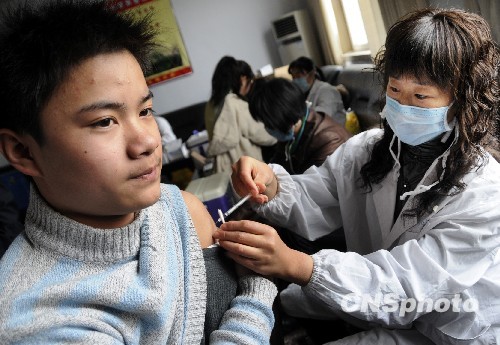 11月16日,山东省枣庄市甲型H1N1流感疫苗接种点正式启动对教师、学生、医生、民警等重点人群的首批疫苗接种工作。中新社发 李宗宪 摄