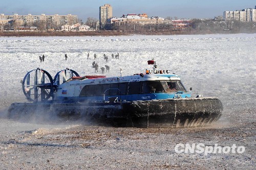 11月17日,黑龙江省黑河海事局大黑河岛办事处的海事执法人员组织协调黑河航运局,一边对黑河口岸附近的江面浮冰进行清理,一边指挥疏导进出港中俄气垫船,确保中俄界河黑龙江流冰期旅客运输安全顺畅。中新社发 邱齐龙 摄