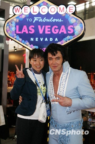 11月19日,2009中国国际旅游交易会在昆明国际会展中心隆重开幕,来自全球94个国家和地区的180个展团亮相旅交会。图为旅交会美国展区前一位扮作“猫王”的工作人员赚足了客商的眼球。中新社发 刘冉阳 摄