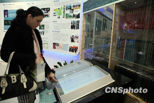 11月19日,来自美、英、法、日等30多个国家驻华使馆的官员代表应邀参观中国科学院建院60周年展览,现场展出的一款中国科学家研发的电子书展品,引得前来参观的外国驻华官员驻足细看。中新社发 孙自法 摄