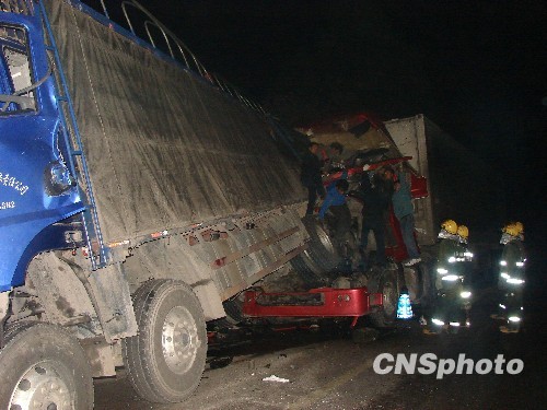 11月24日凌晨2时许,广西南梧公路贵港市平南县与藤县交界路段,三辆大货车连环追尾造成人员一死一伤,道路交通严重堵塞近5公里。中新社发 杨文福 摄