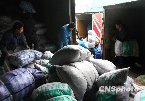 11月24日,由北京民众捐赠的35万件棉衣被,从北京大红门货运站起运,支援甘肃贫困地区。这也是北京市今年首批运往甘肃的救灾物资。中新社发 富田 摄