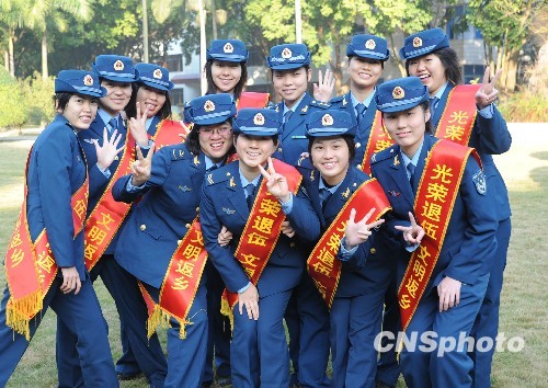 11月24日,驻广西空军某指挥所的退伍女兵们聚在一起合影留念,用自信的笑容向军旅生涯作告别。中新社发 韦君 摄