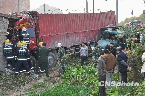 11月24日下午,广西贵港市南环路一辆小货车与一辆大货车相撞后相继冲向路边一处民宅内,造成1人被困2人受伤,民宅部分被冲跨。经过当地消防、交警近一小时的紧急救援,被困者终于被成功救出。中新社发 杨文福 摄