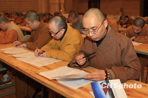 11月25日,常住上海玉佛寺的100多名法师穿着整洁的袈裟,认真地参加“迎世博知识竞赛”。此次活动是玉佛寺围绕2010上海世博会主题举行的一场知识竞赛,希望更多的佛教四众弟子能够了解世博、宣传世博。中新社发 潘索菲 摄
