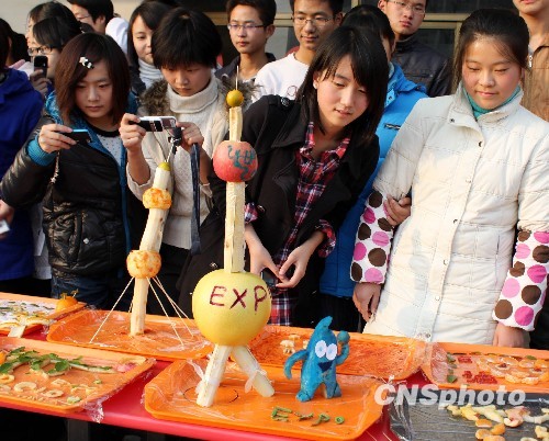 11月25日,安徽师范大学文学院2009级中文2班举行“世博主题水果拼盘大赛”活动。比赛要求同学们在一个半小时内利用提供的水果进行搭配、创作,在注重节约的同时发挥自我创意。原本普通的水果经过大学生巧妙构思,变成了2010年上海世博会会徽、吉祥物海宝等,表达了青年学生对于2010年上海世博会的热切期待和美好祝愿。中新社发 刘淮宇 摄