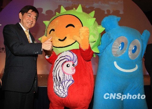 11月26日,东南亚水果之王“榴莲”跃为2010年上海世博会新加坡馆吉祥物,新加坡卫生部长许文远在上海出席世博会新加坡馆吉祥物揭晓仪式,并与吉祥物“榴莲小星”(中)、上海世博会吉祥物“海宝”在一起留影。中新社发 潘索菲 摄