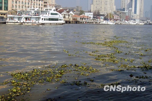 11月26日,上海黄浦江南码头水域聚集了很多水葫芦。近期,受气温上升影响,上海黄浦江水葫芦不断在聚集,有关部门已组织紧急打捞。中新社发 周东潮 摄
