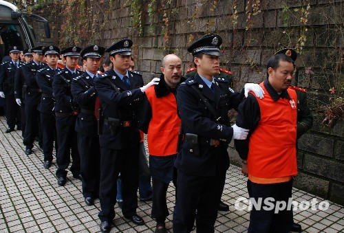 图为陈知益、邓宇平等26人涉黑团伙成员被押入法院。中新社发 胡虹 摄