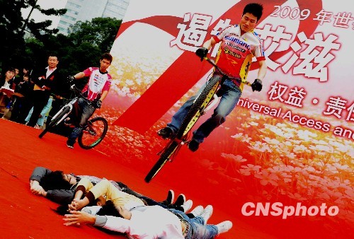 12月1日是第22个世界艾滋病日,一名车手在福州市举行的世界艾滋病日大型宣传活动现场展示空中骑单车“过人”的绝技,吸引众多观众的眼球。2009年世界艾滋病日的主题是“普遍可及和人权”。中新社发 刘可耕 摄