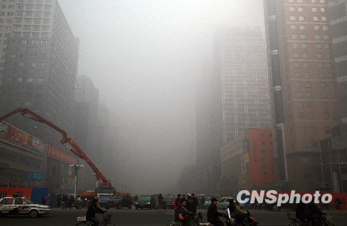 12月1日,已连续9日笼罩在河北中南部的大雾依旧没有消散的迹象。河北省气象台表示,本次出现持续时间较长的浓雾是受地面积雪消融的影响。从上月23日开始,河北省保定、石家庄、廊坊及以南大部分地区持续出现大雾天气,该省已连续多次发布大雾红色或橙色预警信号。图为石家庄市中心浓雾弥漫,能见度不足50米。中新社发 翟羽佳 摄
