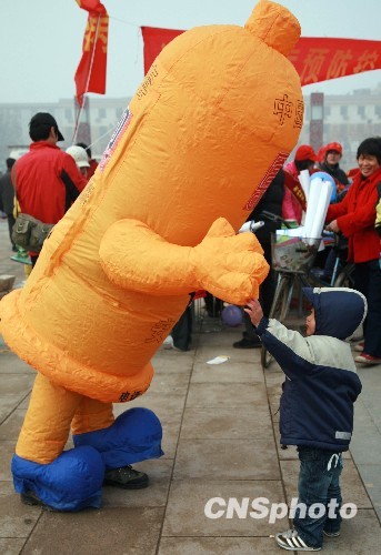 12月1日是世界艾滋病日,在河北省石家庄市博物馆广场上,宣传防范艾滋病的工作人员穿扮成“安全套”开展宣传活动时,吸引了小男孩的目光。中新社发 翟羽佳 摄