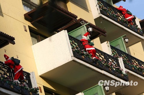 近日,随着圣诞节即将到来,北京圣诞氛围越来越浓厚。在北京某饭店,有许多圣诞老人爬上客房的阳台准备送礼物了。中新社发 富田 摄