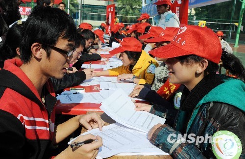 12月5日,是第24个“国际志愿者日”。在福州设立的特奥会志愿者招募现场吸引众多青年踊跃咨询、报名。当日,共青团福建省委、福建省残联、全国特奥会筹委会志愿者工作部、福建省青年志愿者协会联合在福州举行“志愿榕城、欢乐特奥”主题活动。 第五届全国特奥会将于2010年9月19日至25日在福州举行。中新社发 刘可耕 摄