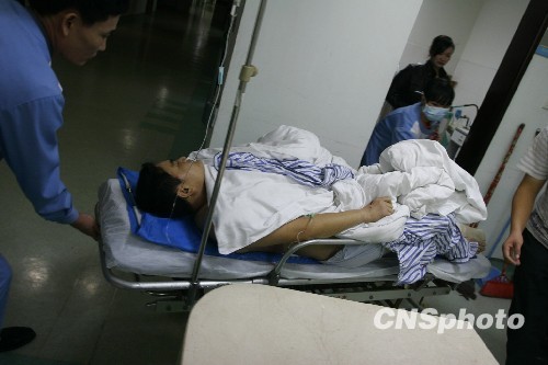 十二月四日下午四点十分许,在建东莞台商大厦发生重大安全事故,用于吊装钢材的塔吊出现问题从高层砸下,造成三人死亡,两人受伤。图为伤者在东莞市东华医院接受治疗。中新社发 李映民 摄