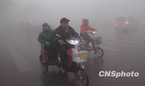 12月8日晨,河北邢台再次出现大雾天气,浓雾笼罩能见度极低,给人们出行和交通带来不便。中新社发 洪生 摄