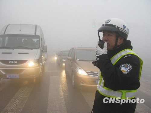 12月8日早晨,河北省邯郸市出现大雾天气,邯郸气象台7时30分发布大雾红色预警信号。在邯郸市人民路与铁西大街交叉路口,交警们提早上岗,利用对讲设备疏导各路口。中新社发 晓忠 摄