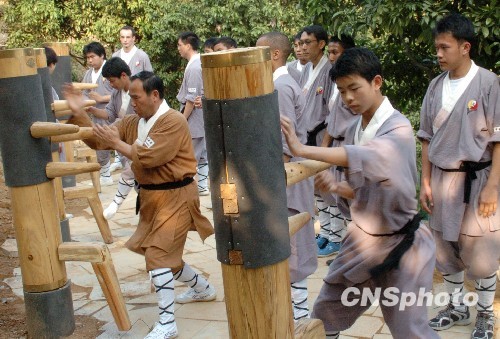 十二月十日,陈有南(黄衣)教练在广东华侨职业技术学校禅武中心,教海外华裔青年禅武文化专修班的学员练习木人桩。来自十三个国家的三十二名华裔青年学员将在此进行为期一个月的禅武、禅茶、书法和中国画的学习。中新社发 罗仰明 摄