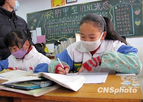 2009年12月10日,山东滨州市尚集中学的学生戴着口罩上课。目前,甲流疫情在滨州进入高发期,并向农村蔓延,农村各中小学学生纷纷戴上口罩上课。中新社发 刘桂林 摄
