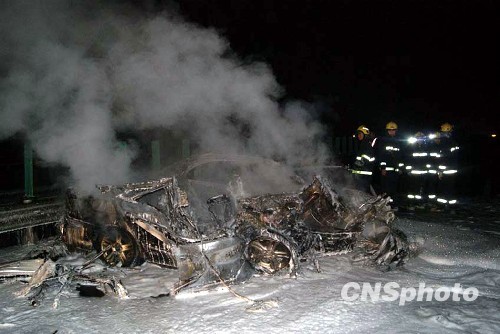 12日凌晨1时43分,位于杭甬高速浙江宁波出口不到2公里处发生一起惨剧,一辆奔驰小轿车与一辆大型挂车发生追尾后撞上公路护栏,奔驰车起火燃烧,事故造成车上两人命丧火海。中新社发 何蒋勇 摄