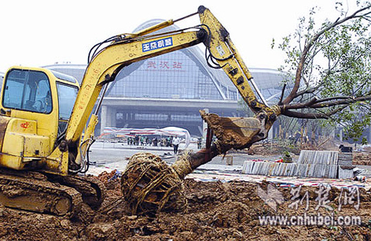 12月13日上午,武汉站西广场上呈现一番忙碌景象,几百名园林工人正在栽树。一园林工人告诉记者,他们将在此栽种8万棵大树,还会添一些园林景观,以迎接武广客专正式开通运营。刘中灿 摄