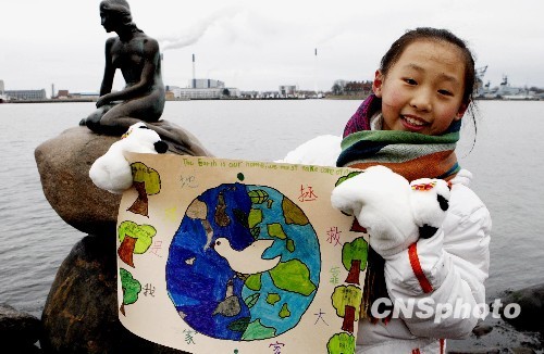 12月中旬,正在丹麦哥本哈根举行的联合国气候会议吸引各国关注,在哥本哈根海边安徒生童话中的“美人鱼”铜像旁,来自北京清华附小的一名10岁小学生举着自己画的环保作品,呼吁拯救地球人人有责。中新社发 钱兴强 摄
