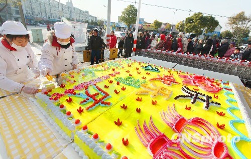 12月19日,江苏省泰州市一超市推出了一只约5平方米大小的巨型蛋糕,在街头分发给过往市民。蛋糕由100斤面粉、48支奶油、8种水果制成,近500位泰州市民品尝到这个“大块头”蛋糕。中新社发 张庆龙 摄