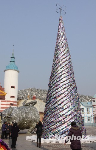 12月21日,由近万张废旧光盘装饰出的18米高的环保圣诞树正式完工,矗立在长沙世界之窗公园的内广场上。为过一个环保圣诞节,世界之窗今年的圣诞树摒弃了传统的将树砍下装饰成圣诞树的做法,而是将公园内的小树挂上装饰,并且用废旧光盘装饰出巨型环保圣诞树。中新社发 肖前辉 摄