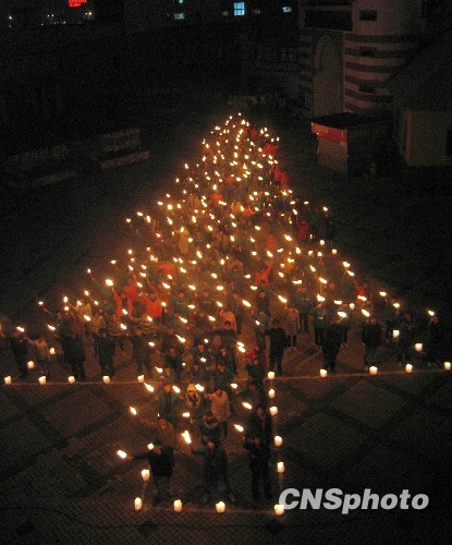 12月21日晚,300多名游客在长沙世界之窗公园内广场上高举手中的火把,摆出圣诞树队形,预热即将到来的圣诞节。据悉,12月24日平安夜,该园还将组织2010名游客排列出超大、超震撼的圣诞树造型。中新社发 肖前辉 摄