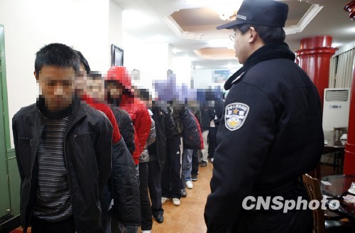 近日,北京海淀警方端掉一火锅店招牌的地下赌场,十几名在火锅店内聚众赌博的赌客们被警方控制,当场起获赌资二十四万余元。目前,设赌的周某等3名嫌疑人被海淀警方刑事拘留,其余十多名参赌者和放贷者被行政拘留,案件还在进一步审理中。中新社发 苗春萌 摄