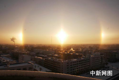 中新网阿克苏12月23日电(刘新 陈志成)12月23日早10点50左右,大雪过后的新疆塔城市,天空中出现巨大而清晰的日晕奇观,宛如三个太阳。 日晕是一种比较罕见的天象,有全晕圈和缺口晕。是日光通过云层中的冰晶时,经折射而形成的光现象,围绕太阳环形,呈彩色。日晕的出现,往往预示天气要有一定的变化。