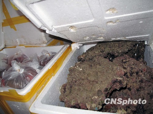 12月22日凌晨1点左右,北海市公安局特警支队在北铁一级公路收费站检查一辆北海开往广州的大巴车时,查获10箱国家二级保护动物活珊瑚。这十箱活珊瑚包括有造礁类珊瑚、柳珊瑚、软珊瑚等7种类别,全部都是国家二级保护动物。目前,查获的这批活珊瑚全部寄养在北海市海底世界的水族馆里,除了部分死亡外,大部分活珊瑚都存活下来。图为查获的活珊瑚。中新社发 李剑萍 摄