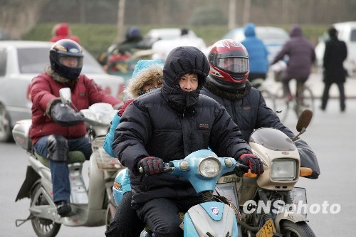 2009年12月25日,在山东潍坊市区街头,外出的行人纷纷全副武装抵御寒风,整个城市被一层沙尘所笼罩。当日,受快速南下的强冷空气影响,山东潍坊迎来了大幅降温过程,同时伴随着大风扬沙,气温将下降8~10摄氏度,最低气温跌至零下10摄氏度,外出的市民们纷纷身穿棉衣、头戴棉帽抵御寒流的侵袭。中新社发 张驰. 摄