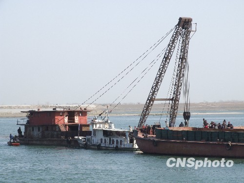 12月27日上午11时左右,一艘装载200余吨黄沙的运沙船在汉江湖北襄樊催家营大坝船闸下方侧翻沉江,所幸没有人员伤亡,事故船只侧翻沉江没有影响催家营大坝船闸航道通行。目前,多艘救捞船只正在组织救捞。中新社发 李得荣 摄
