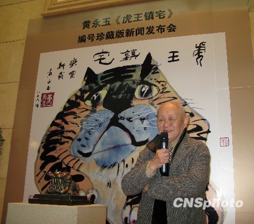 12月28日,被称为一代“鬼才”的黄永玉大师在北京船艺术馆出席了《虎王镇宅》编号珍藏版新闻发布会。《虎王镇宅》是著名画家黄永玉先生为迎虎年而精心创作的生肖画,其形象生动、气势非凡,是生肖画里的精品之作。为了让更多的收藏爱好者欣赏并拥有《虎王镇宅》,融德画廊联合船艺术馆隆重推出了《虎王镇宅》编号珍藏版,其中签名版限量一百张,普通版限量五百张。《虎王镇宅》有望成为平常百姓家的“镇宅”之宝。中新社发 王彤 摄