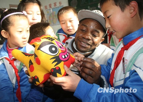 12月29日,山东博兴县实验小学组织开展“学民俗 迎新年”活动,来自英国的外教高峰(英文名Gabby)也兴致勃勃地参与进来,小学生们踊跃担任起他的“民俗教师”,手把手指导外籍教师缝制布老虎、书写春联等,帮助他学习我国系列民俗文化知识,共同迎接我国即将到来的农历虎年。中新社发 陈 彬 摄