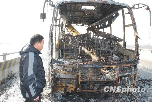 12月29日上午9时30分许,一辆从徐州开往济宁的大客车经过市中区洙赵新河桥时发生自燃,车体后部发送机上方突然着火。司机发现后立即停车并用灭火器灭火。由于火势太大,在当地消防员赶到后火灾才被彻底扑灭,客车完全报废。事发时车上只有一名乘客,事故并没有造成人员伤亡。中新社发 肖山 摄
