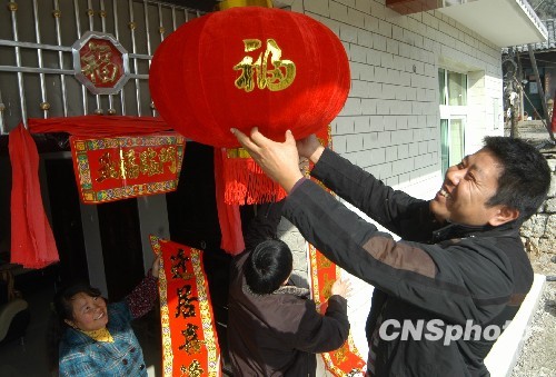 12月29日,四川江油市含增镇谭庄村1组刘万军家搬进179平方米的新居,和家人在新房大门前挂灯笼贴对联,喜迎新年。去年灾后重建以来,含增镇党委政府始终把农房重建作为头号民生工程,党委成员、机关干部包村入户,层层落实责任,力保受灾群众2010年春节前全部住进新房。目前,该镇灾后1250户农房重建户已有1227户陆续搬进新居,余下23户将于春节前全部住进新房过年。 中新社发 成和平 摄