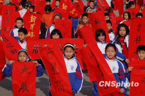 2010年元旦前夕,湖南石门的200多名小书法爱好者用书法比赛的方式,表达对新年的美好祝愿。中新社发 贺新初 摄