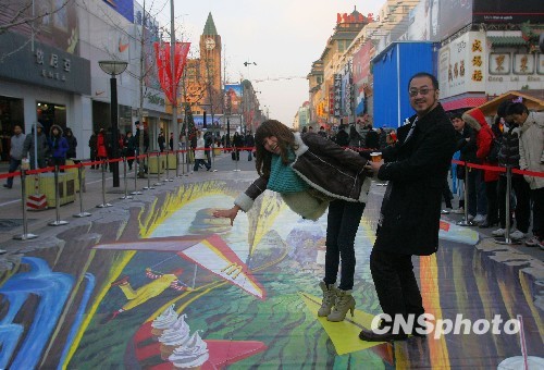 12月30日,北京王府井大街出现了一幅巨型立体地画,游客纷纷在地画上拍照留念。中新社发 苏丹 摄