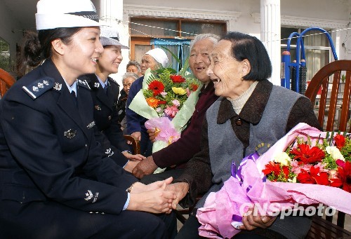 12月30日,河南商丘市公安交警支队的“警花”们带着鲜花和慰问品,来到商丘市第一老年公寓看望老人们,警花们帮老人梳洗打扮、拆被洗衣、清扫院子,聊天问寒暖,与老人们同迎新年佳节,祝老人们健康长寿。