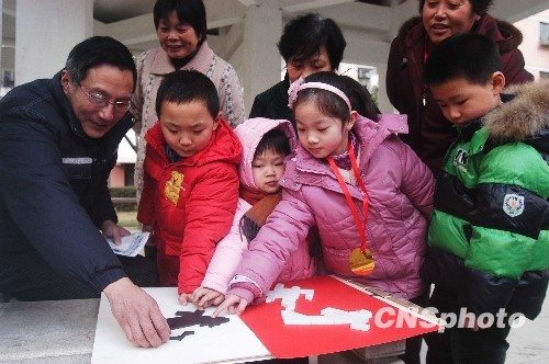 12月30日,江苏扬州市兰庄社区朱建淮老先生在为社区居民演示他发明的“十五巧板拼图”。据了解,这套“十五巧板拼图”是他根据易经五行八卦思想而发明的,并获得专利证书。中新社发 范友林 摄