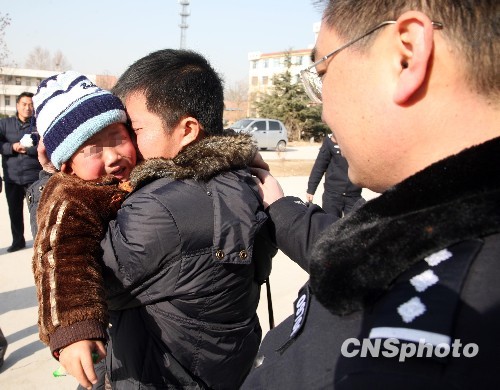 12月30日,山东省菏泽市公安局民警亲手将解救出的被拐卖儿童小权权交给其父亲赵某手中,离别10个月的父子重新团聚悲喜交加。刚满4岁的小权权家住湖南邵阳市,2009年2月14日随父母在云南昆明打工时,被人贩子几经转手后以3万余元拐卖到山东菏泽。案发后,云南昆明和山东菏泽两地警方缜密侦察,攻破此案,将被拐卖儿童平安解救出来。 中新社发 刘心中 摄